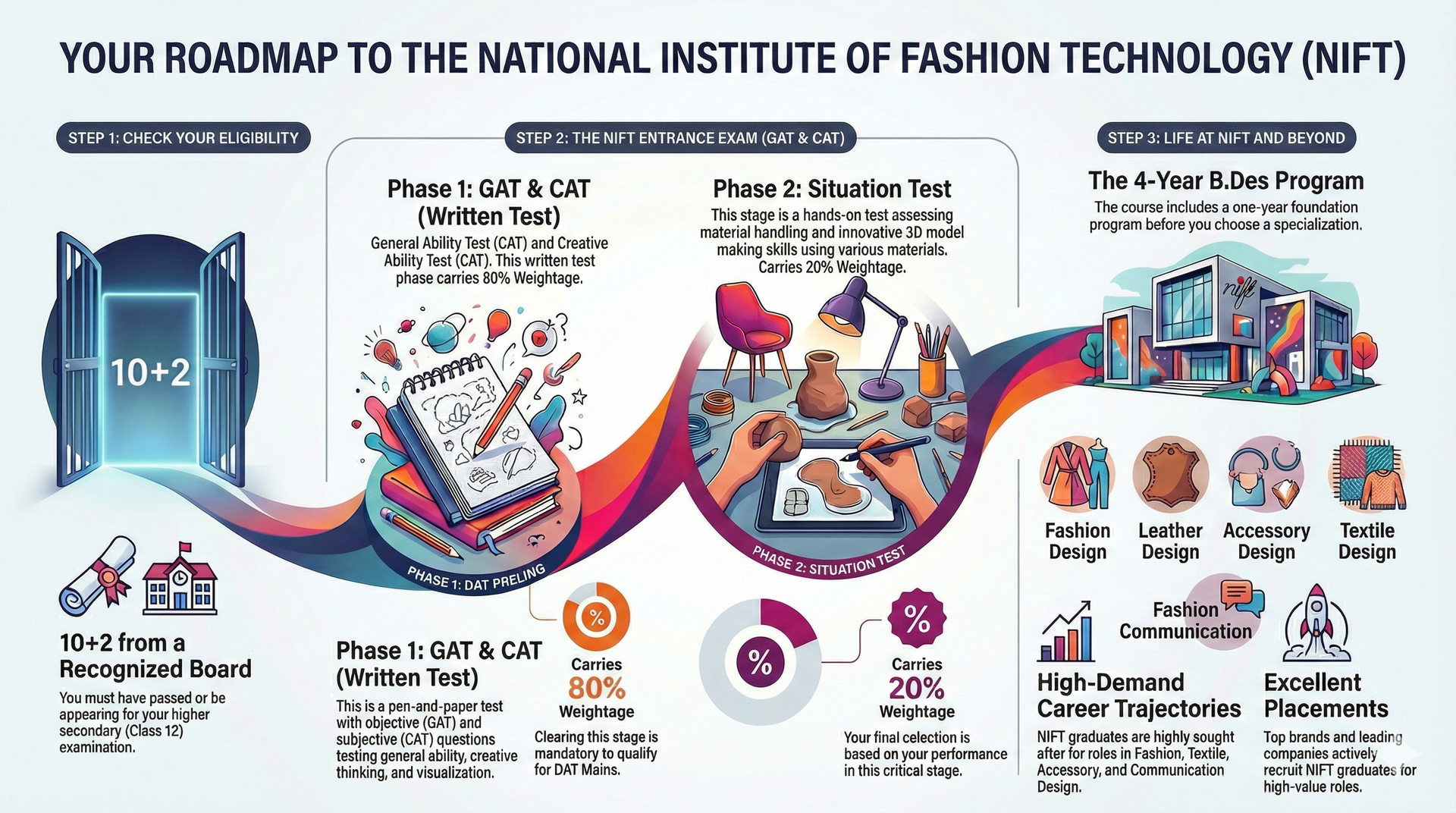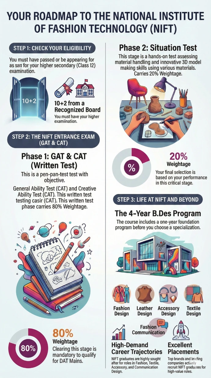 NIFT conducts Creative Ability Test (CAT) and General Ability Test (GAT) for admission.